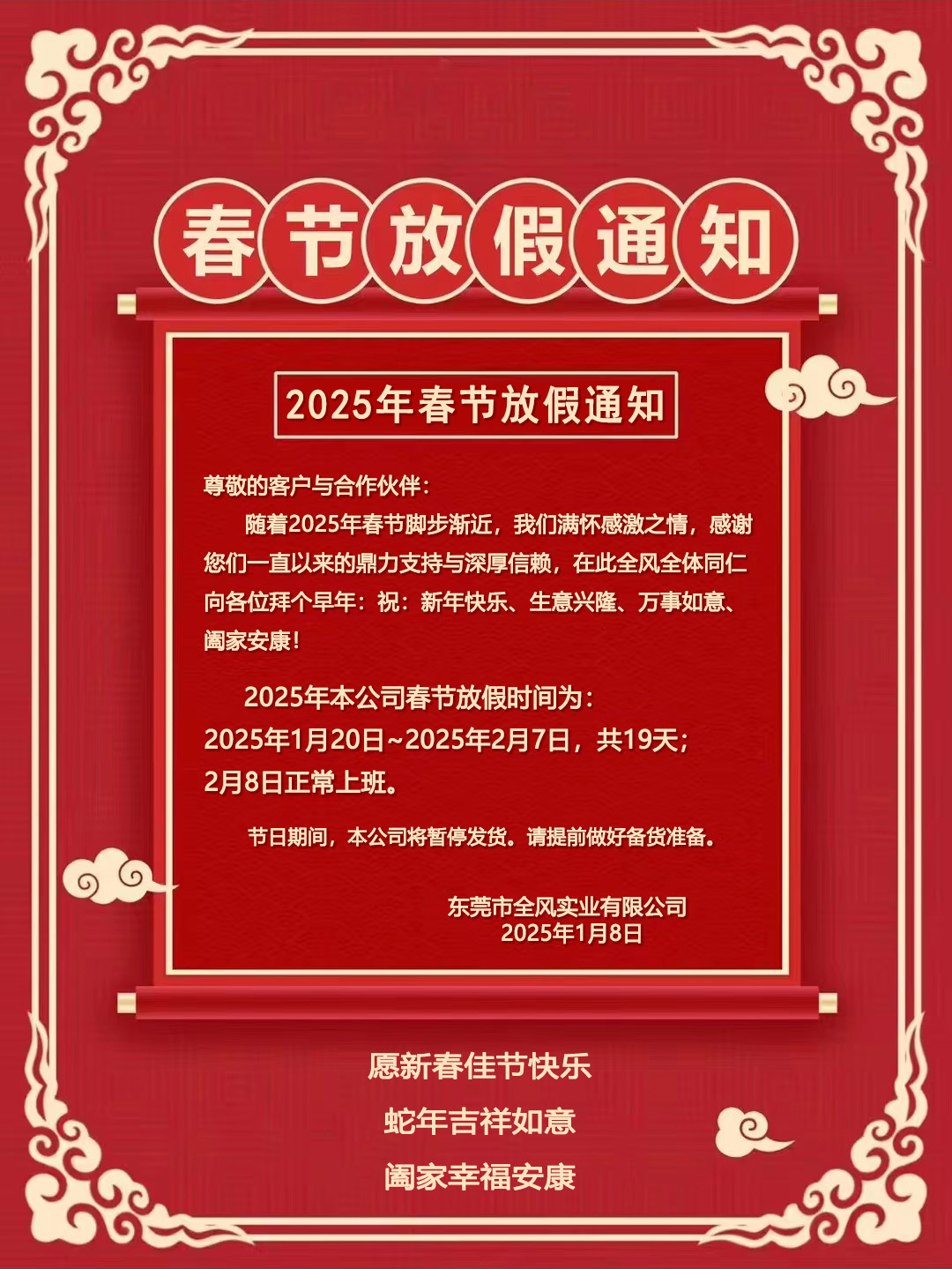 东莞市全风实业有限公司2025年春节放假通知