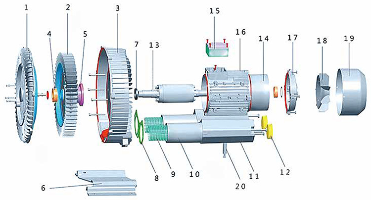 4、轴承 | 9、消音网 | 14、电机 | 19、电机后罩 |