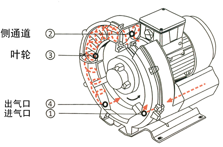 气体由吸气口1吸入,但它进入侧通道2以后,旋转叶轮3在旋转方向上给气体一个速度,同时叶片上离心力使气体向外加速且压力增加。