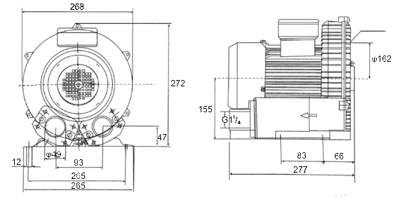 当叶轮3转动时,由于离心力的作用,风向标促使气体向前向外运动,从而形成一系列螺旋状的运动。叶轮刀片之间的空气呈螺旋状加速旋转并将泵体之外的气体挤入(由吸气口1吸入)侧槽,当它进入侧通道2以后,气体被压缩,然后又回复到叶轮刀片间再次加速旋转。当空气沿着一条螺旋形轨道穿过叶轮和侧槽时,每个叶轮片增加了压缩和加速的程度,随着旋转的进行,气体的动能增加,使得沿侧通道通过的气体压力进一步增加。当空气到达侧槽与排放法兰的连接点(侧通道在出口处变窄),气体即被挤出叶片并通过出口消声器4排出泵体。
