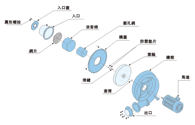 3、中压透浦式风机与系统的连接管道应密封可靠,对小真空泵可采用金属管路连接密封垫采用耐油橡胶,对小中压透浦式风机可采用真空胶管连接,管道管径不得小于中压透浦式风机吸气口径,且要求管路短而少弯头。